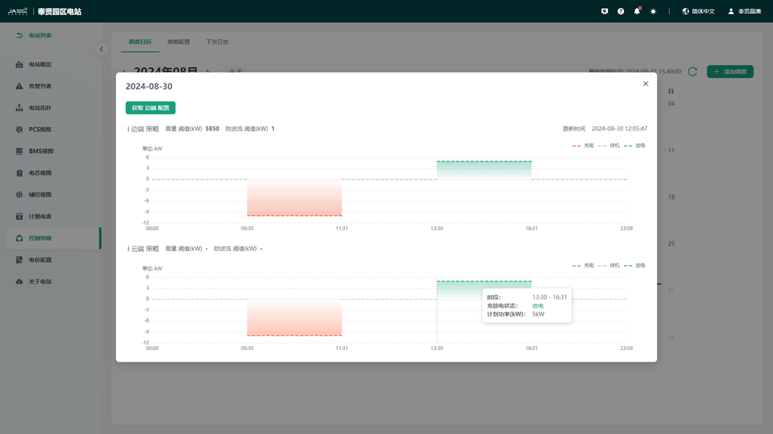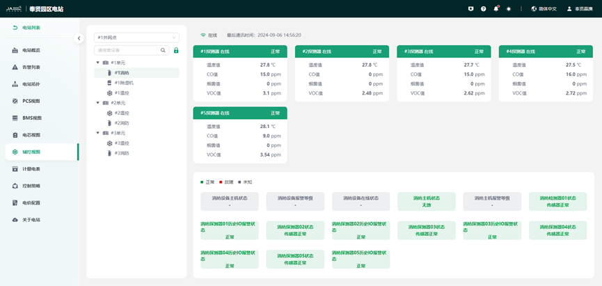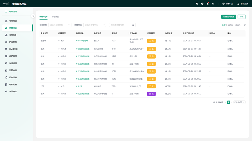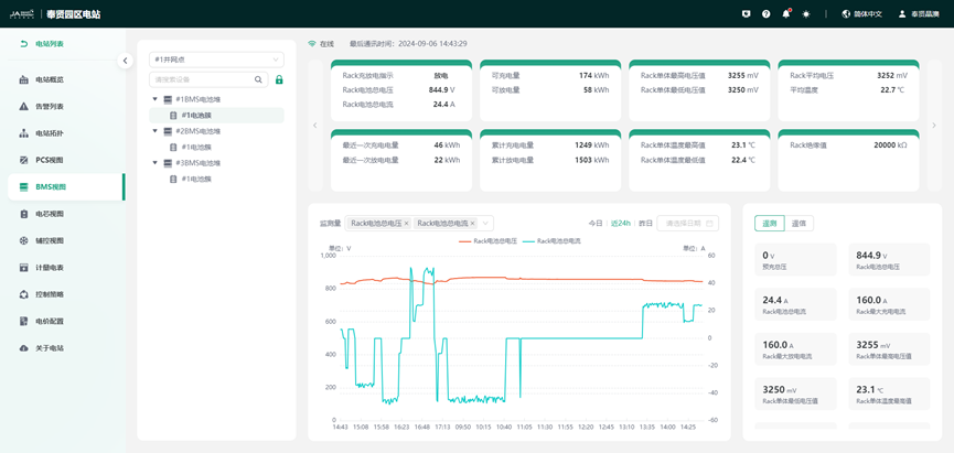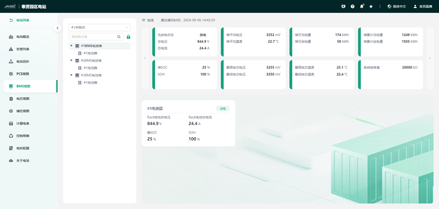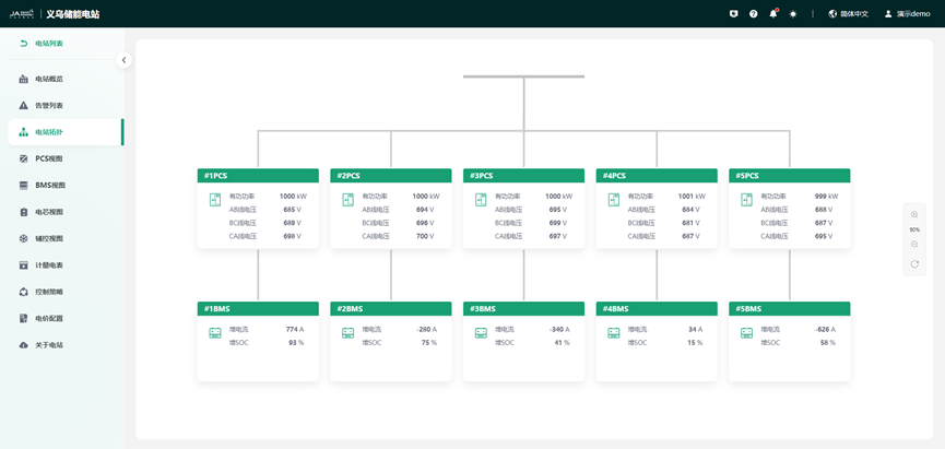 通过主接线图形式呈现电站设备连接拓扑,设备关联关系清晰可见。同时针对关键设备PCS和BMS支持查看实时的电压、电流、功率和SOC等运行参数。