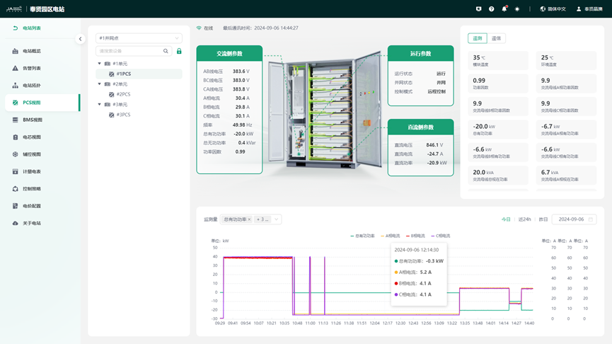 电压/电流、交流频率、工作温度、直流侧功率、电压和电流等。PCS 详情页面主要展示为该交流室内的 PCS 的运行控制、运行状态、功率曲线以及 PCS 设备的保护状态等。