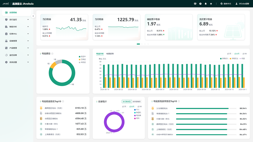 运营看板呈现了所有电站的聚合数据,电站装机规模及分布、总收益、充放电量、电站效率排名、收益排名等运营大盘信息,数据一目了然。