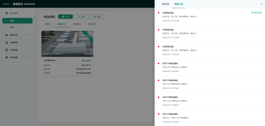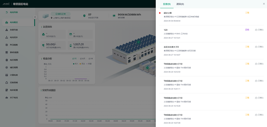 【消息通知】汇聚了本用户被授权电站正在发生的告警总数和消息概览,支持查看消息详情。同时支持查看个人的系统通知。