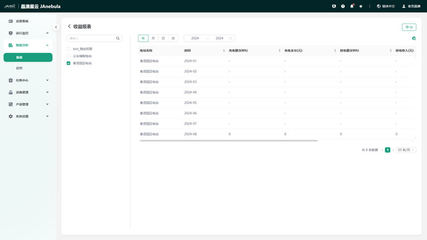 能源报表,收益可“观”,提供统一的报表服务。自定义报表,动态生成模板。支持单站/多站电量分析、单站/多站收益分析、多站间电量/收益对比分析。 报表数据聚合粒度丰富,支持15/30/60min分钟级数据聚合,输出年/月/日报表并支持报表灵活导出。