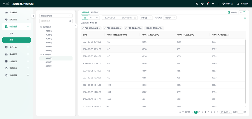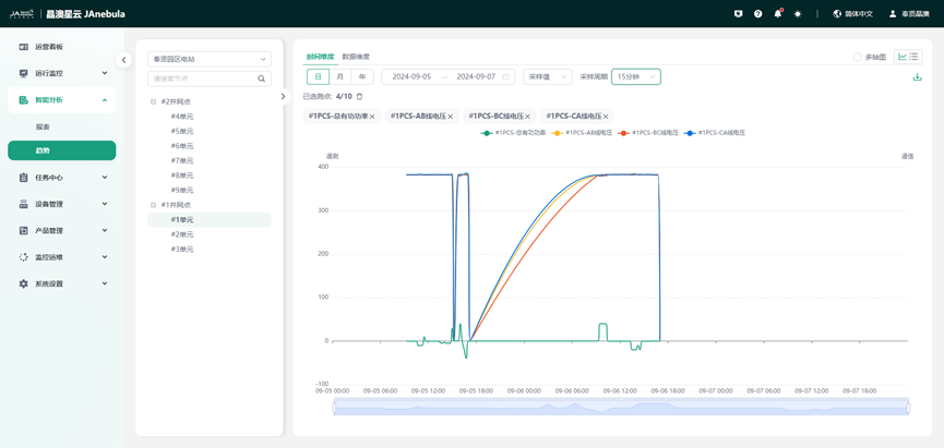 通过趋势分析,可以自定义查询某电站某设备的测点数据历史曲线,并支持不同设备同一测点的对比分析。