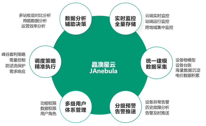 借助云计算和物联网技术,晶澳星云能够为分布式的能源设备提供全面的运行监控、故障预警、远程控制和能量优化等支撑服务,减少运维人员工作量,降低运营成本,并通过峰谷价差与需量调节,帮助用户收益最大化。整体功能框架如下: