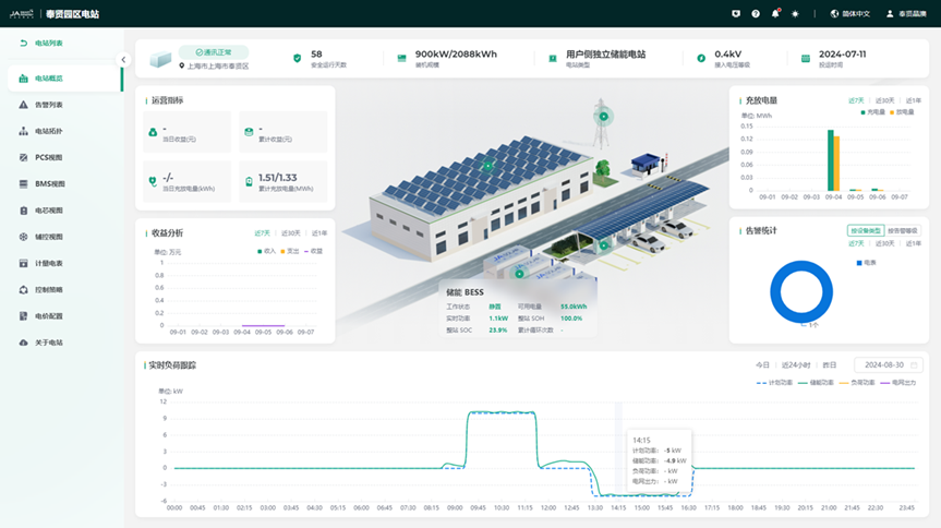 单站视角呈现电站的收益、充放电量,整站sox、可用电量和负荷跟踪曲线,并汇总告警异常总数。时刻感知电站状态与外部环境,保障BESS运行状态最佳。
